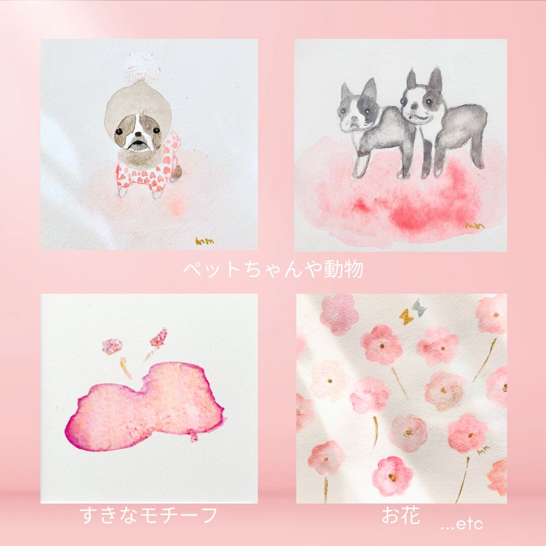 など、ご希望のモチーフを自由にオーダー頂き、それぞれの特徴を大切にしつつ、白の背景に落とし込んでピンク色を足して制作いたします。